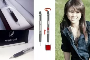 Bajo la marca Winkpen, Jessica Chan, diseñadora industrial de Oregon (Estados Unidos) ha creado un dispositivo reutilizable que permite aspirar vino (o cualquier otro líquido que tiña) y escribir en el papel sin necesidad de usar tinta.